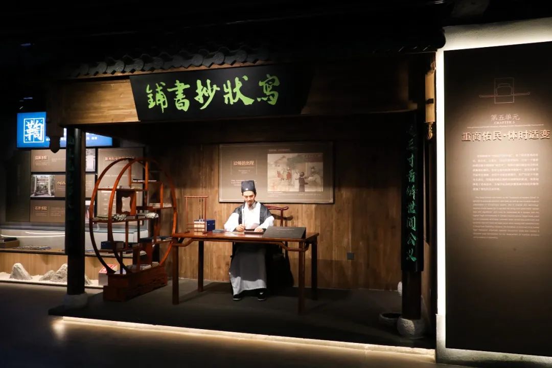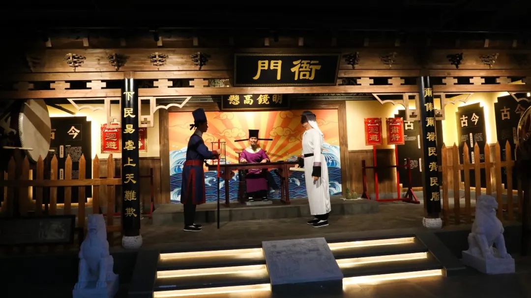 穿过“小山丛竹”书院门,第一眼就落在远处正在升堂审理的衙门之上。以灰色为主基调的司法制度区,通过写状抄书铺、以牛赎罪案例、公堂衙门等几个场景,还原宋朝自上而下重法尚法的浓厚法制氛围。宋朝被称为最接近现代社会的“拂晓时刻”,从立法水平、立法数量、法律知识普及、法律职业群体的形成来看,堪称中国封建社会法制成就最高的朝代。