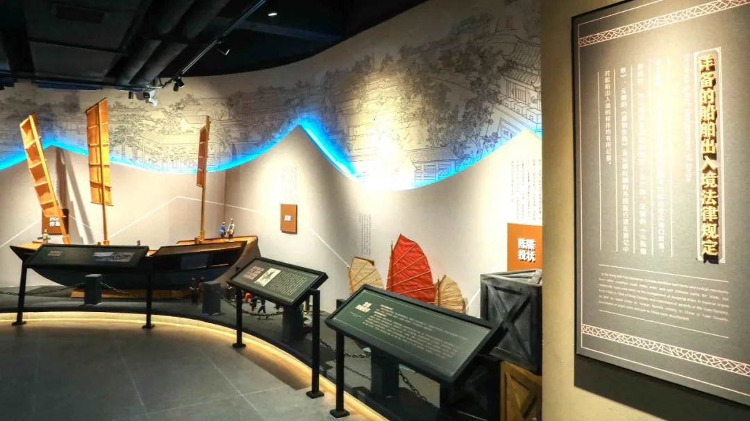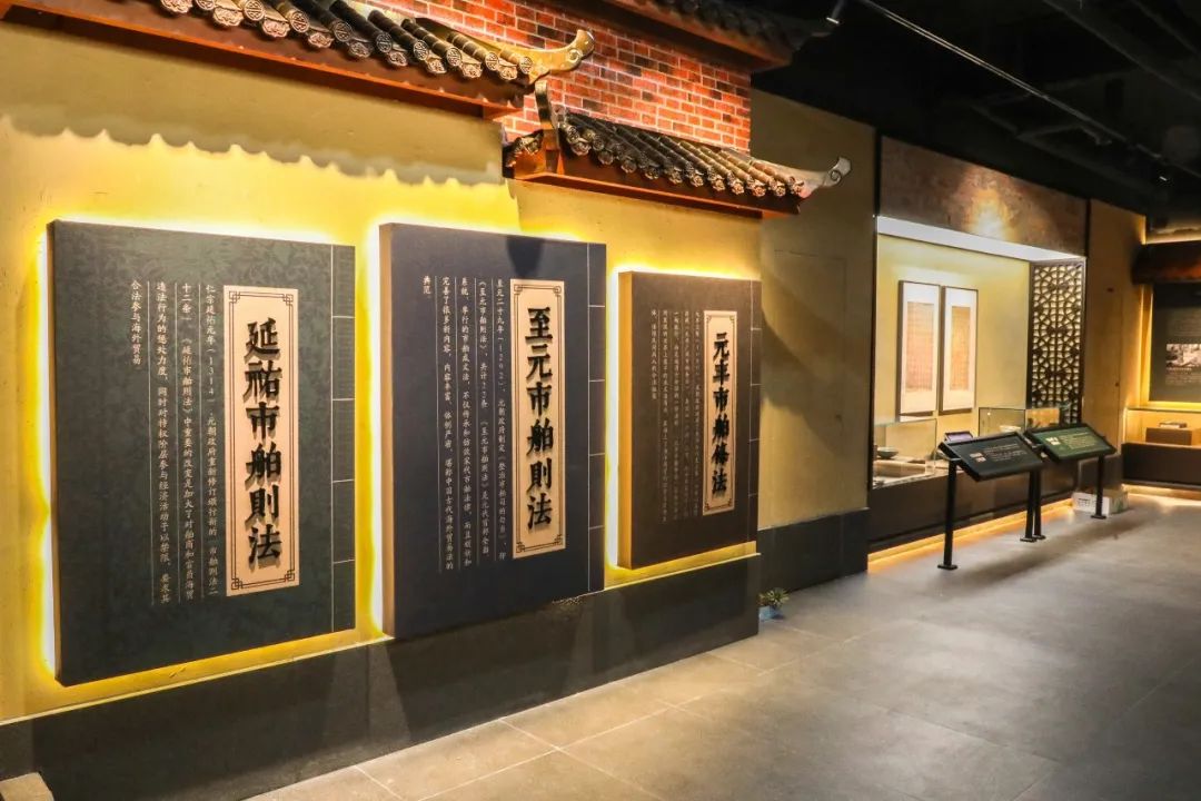 继续缓步前行,展示在眼前的是宋元时期三部非常重要的海外贸易管理法律法规,宋朝颁布了世界上第一部成文海商法——《元丰市舶条法》,元朝在此基础上继续完善,制定了《至元市舶则法》和《延祐市舶则法》。市舶法作为当时海外贸易管理的基本法律依据,保护积极贸易,打击非法贸易,惩治贪污腐败,标志着中国古代海外贸易进入了法制时代。