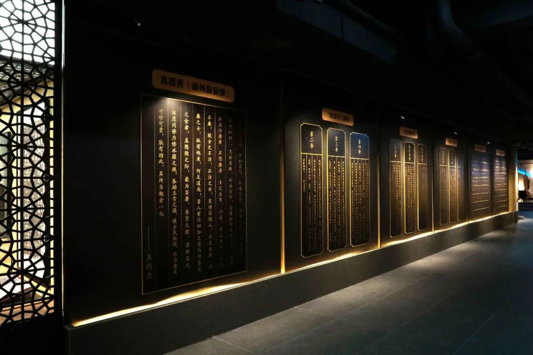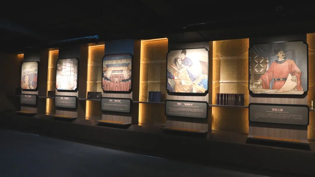 踏入这一区域,目及皆是一个一个鲜活的案例展示。从苏轼主审的四个海贸违法案件,到真德秀的廉洁判词,从《至元市舶则法》九条“反贪污”条款到五个鼓励积极贸易的案例,展现形式丰富多彩,整体布局清晰流畅,有案例手绘图、有漆线雕刻画、还有黑色仿古牌匾墙,一步一景,营造了严谨肃穆的环境氛围。