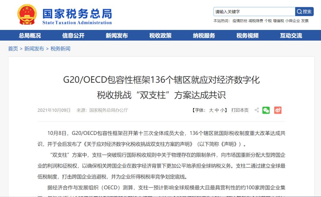 近日,G20/OECD包容性框架召开第十三次全体成员大会,136个辖区就国际税收制度重大改革达成共识,并于会后发布了《关于应对经济数字化税收挑战双支柱方案的声明》(以下简称《声明》)。