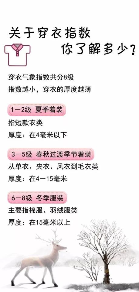 穿衣指数是根据自然环境对人体感觉温度影响最主要的天空状况、气温、湿度及风等气象条件,对人们适宜穿着的服装进行分级,以提醒人们根据天气变化适当着装。