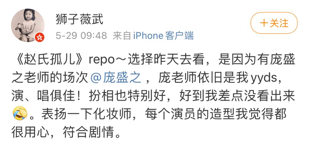 6、之后你也演过一些音乐剧,比如今年非常火爆的《赵氏孤儿》,真的很棒。参加这样一个大组,给你什么样的感觉?