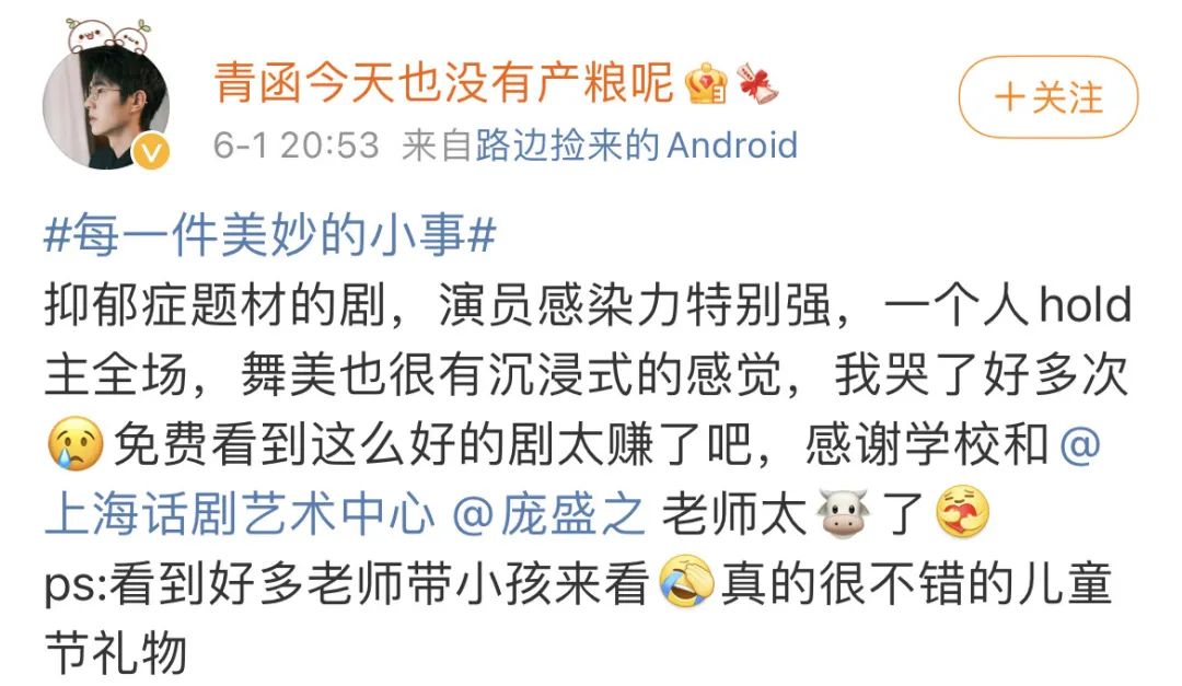 庞盛之:《每一件美妙的小事》,这个作品太独特了。这是我一直都很喜欢的一部剧,但是此前都没有看过,因为每次这部剧在演出的时候我也恰巧在演出,就没机会去看。但是当我接到这部戏的面试通知时特别开心。我说我一定要去面试,面上了之后真的超级激动。我可能是一个很感性的人,感觉得到了一种认可。