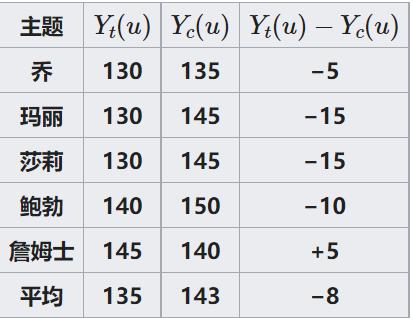 真正的平均因果效应是 -8。但是对这些人的因果效应永远不会等于这个平均值。因果效应各不相同,因为它通常(总是?)在现实生活中也是如此。在随机分配处理后,我们可以估计因果效应为:
