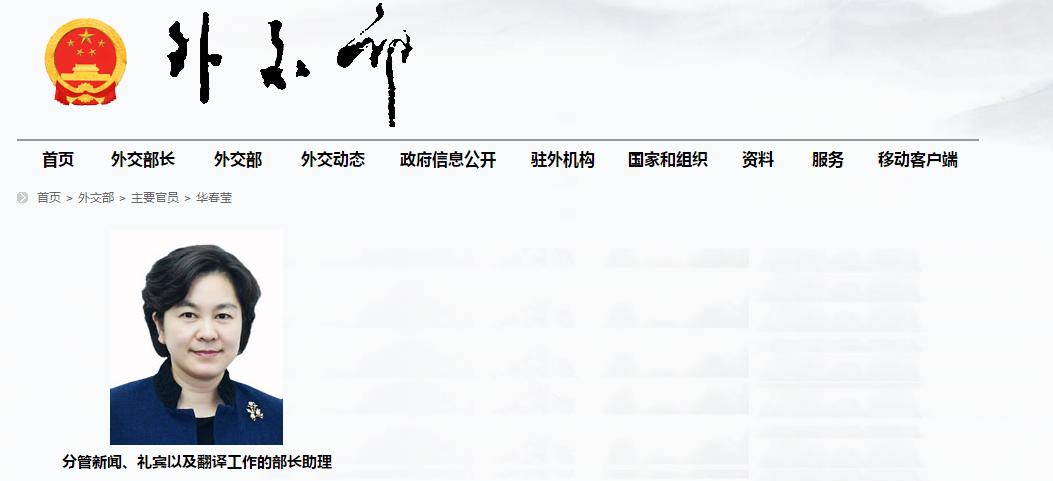 外交部官网“主要官员”一栏最新信息显示,华春莹已任外交部部长助理,分管新闻、礼宾以及翻译工作。