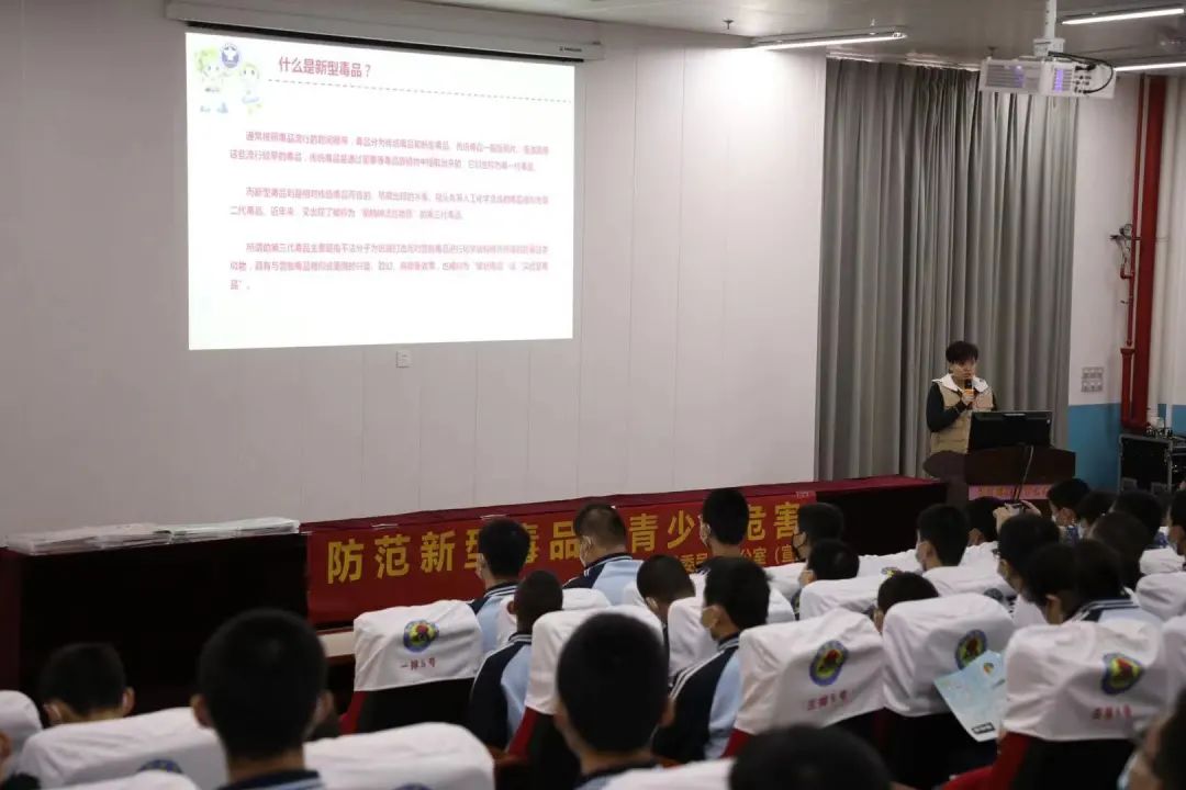 禁毒主题班会上,禁毒志愿者通过图片展示、案例分析,生动形象地向线上线下的青少年介绍了什么是新型毒品、新型毒品的种类和危害等知识。