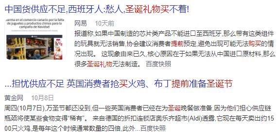而缺货的欧美则是另外一幅景象,因为航运危机等因素,咱们给过去的货物不足,老百姓们已经提前两个月抢购圣诞礼物了。