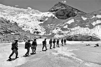 巴弄卓康哨所官兵在巡逻途中携手通过冰川。