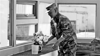 吴杰皴裂的手常常打理那些花儿。阳光的照耀下,那些花儿开得正艳。在高原上,能有这么多五颜六色的花是多么的幸福。吴杰说,“哨所官兵常年都看不到绿色的花草,所以很多爱心人士给哨所寄来了假花。”
