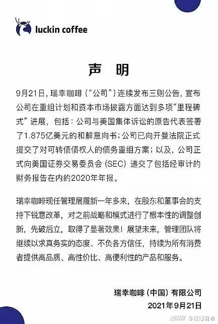 当时瑞幸咖啡发布了一则声明,提到公司在“重组计划和资本市场披露方面”的几个重要进展,其中两项,一是公司与美国集体诉讼的原告代表签署了1.875亿美元的和解意向书,二是公司向法院提交了对可转债债权人的债务重组方案。