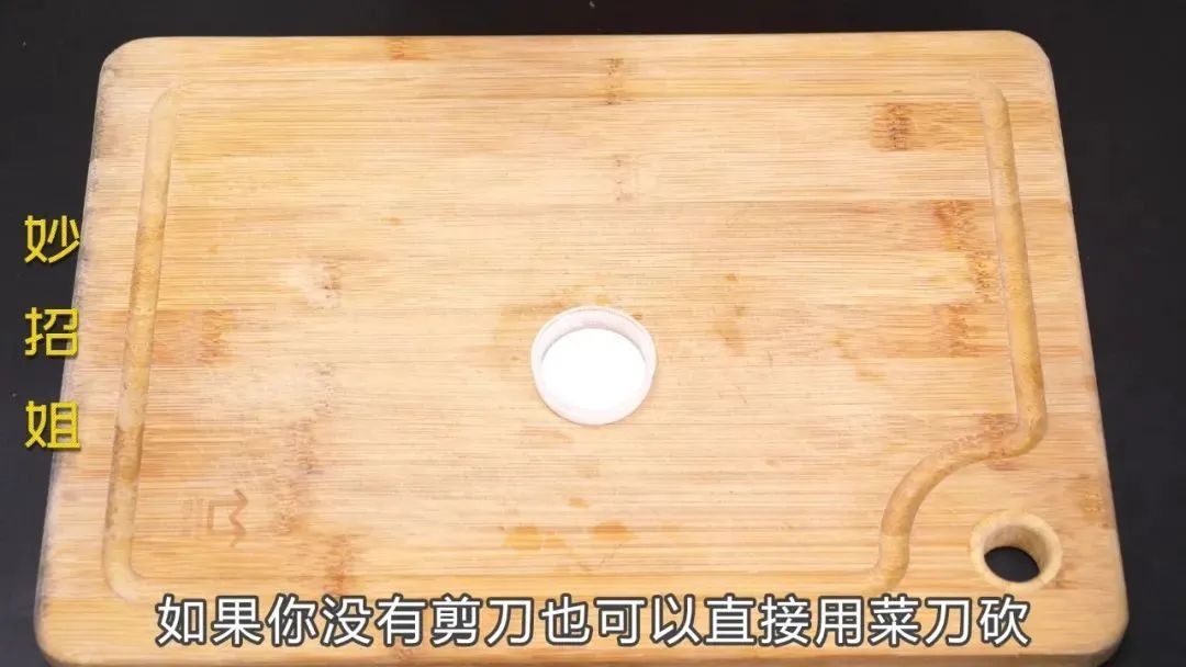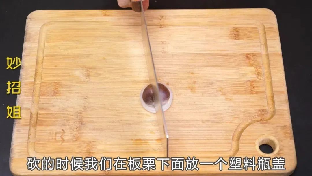 没有剪刀也可以直接用菜刀砍,砍的时候我们在板栗下面放一个塑料瓶盖,这样板栗就不会乱跑,也不用担心砍到手,安全又好用。