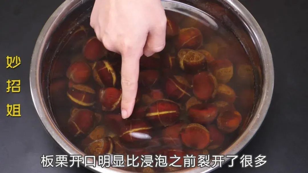 浸泡到开水不烫手时,我们就可以开始剥板栗了,板栗开口明显比浸泡之前裂开了很多。