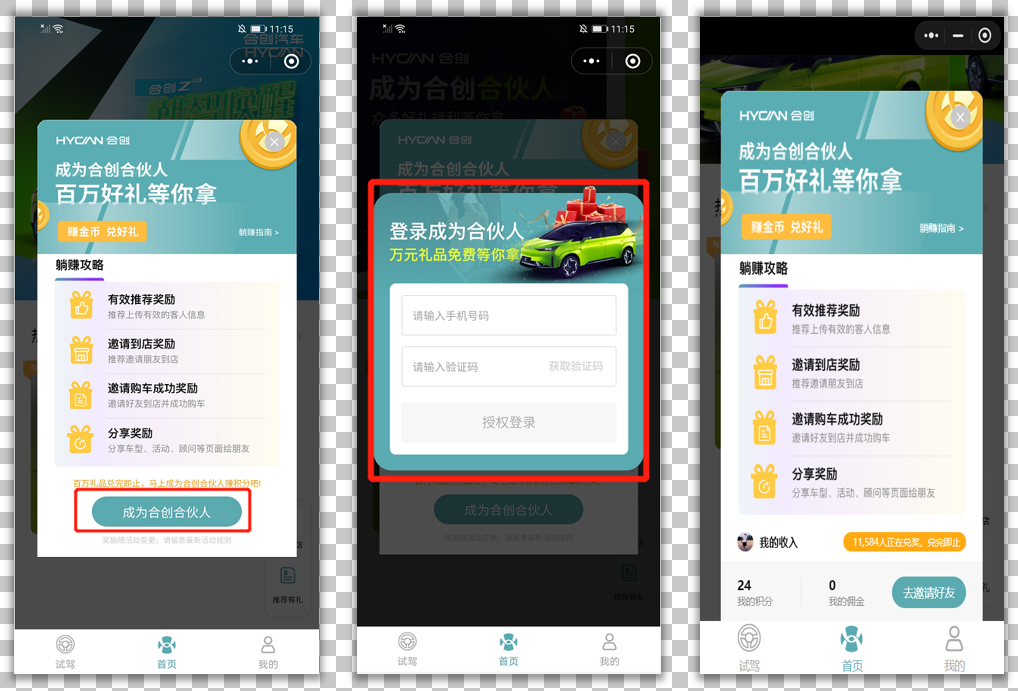 合创汽车的合创合伙人体系最大限度的简化了注册、操作和提现流程。依托小程序这一轻量级平台,即不占内存也能联通微信里的庞大人脉资源。仅用手机号即可注册成为合创合伙人并积分奖励。积分可以在合创商城兑换超值礼品。成功推荐他人大定还可以获得不菲佣金,直接提现到银行卡。整个推广过程透明清晰,操作简单,手续便捷。