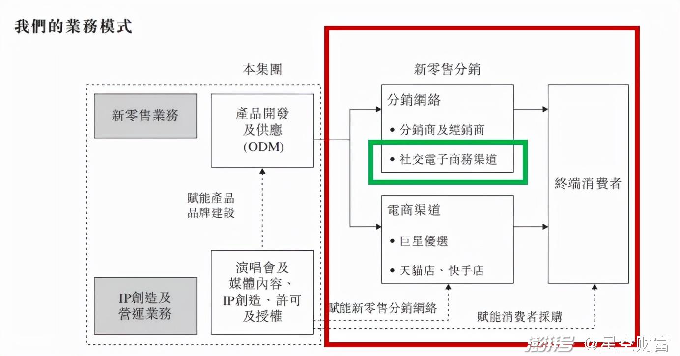 其实如果仔细研究巨星传奇的业务模式图,我们应当有如下的大致判断,那就是公司最值钱的资源其实是下图红框所列示的新零售分销渠道,在新零售分销渠道中,最最赚钱的当属社交电子商务渠道,即所谓的微商。