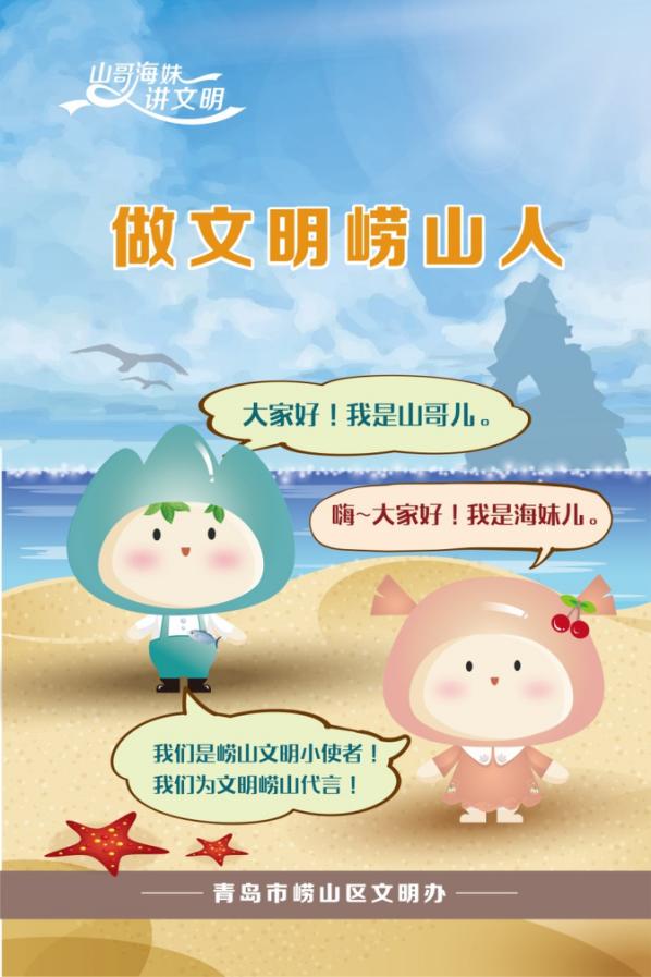 为引导广大居民群众深入开展“讲文明 树新风”活动,积极参与文明城市、文明单位、文明社区、文明校园、文明家庭等系列文明创建,争当文明市民,崂山区新时代文明实践中心推出了文明使者卡通人物——“山哥儿”“海妹儿”,用新颖的形式助力新时代文明实践工作,奏响崂山文明创建“新强音”。