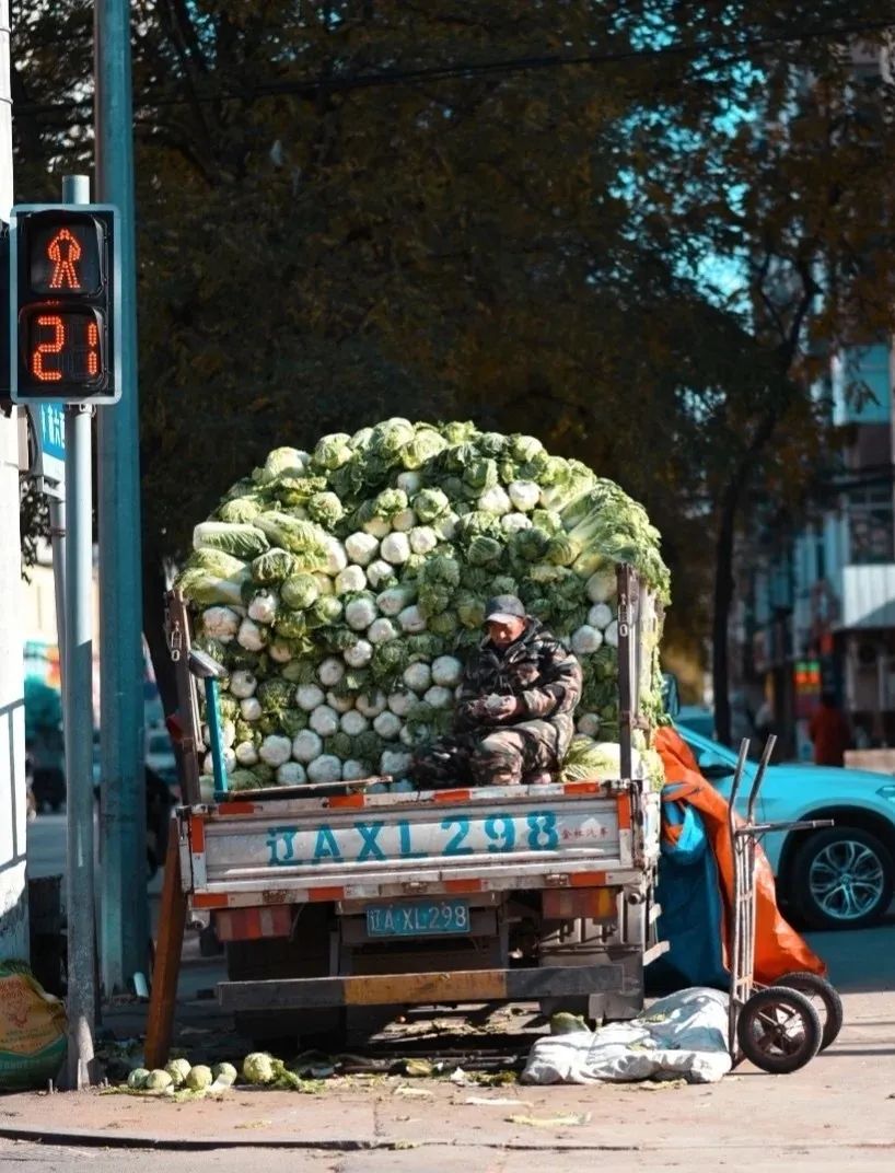在东北菜市场你能看到,菜是一卡车一卡车拉来的,堆成小山似的。