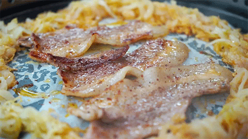 还有烤酸菜也是一绝,五花肉炙烤后冒着油滋滋的光,酸菜烤后增添了一丝锅气,一口吃下是天作之合。