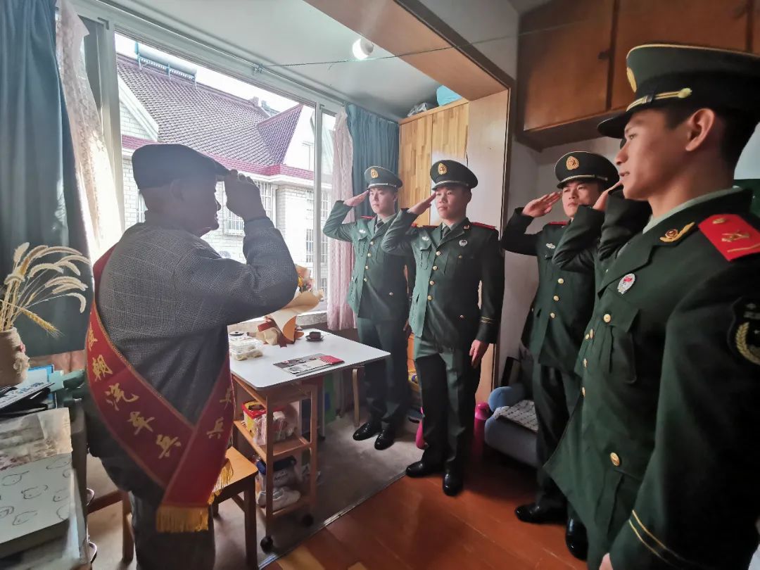 当战士们在临走时,气宇轩昂地说出“敬礼”二字时,这位94岁的老兵情不自禁地抬起手回敬军礼。