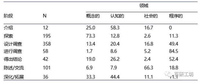 表1 在所有七个项目中,教师和学生在每个探究阶段对科学知识各领域的相对引用量