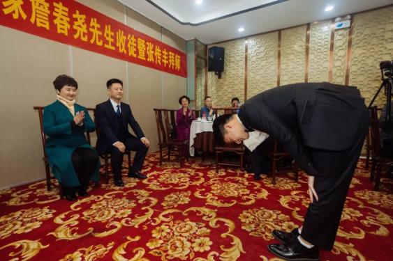 收徒仪式中,22岁的张传丰向师父詹春尧和师娘张虹恭敬地三鞠躬,敬献礼物和鲜花,敬茶。他表态说:“一日为师,终生为父,我一定遵从师训,踏踏实实做人,认认真真演戏,做一个好学上进的弟子,做一个品行端正的演员,绝不给老师丢脸抹黑,绝不辜负剧院对我的关心培养。”