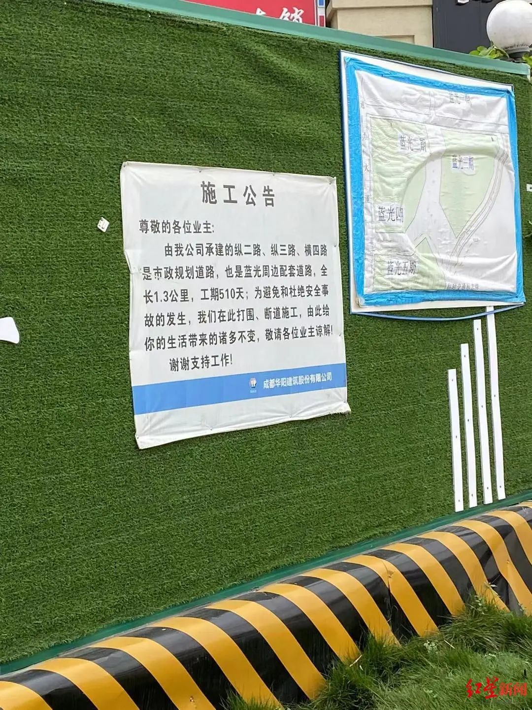 现场的施工公示信息显示,成都华阳建筑股份有限公司承建了蓝光社区内,纵二路、纵三路、横四路等社区配套路段,全长1.3公里,工期510天,于2020年12月19日开始施工。