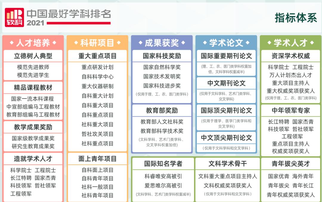 软科中国最好学科排名的指标体系包括人才培养、科研项目、成果获奖、学术论文、学术人才五个指标类别,下设17个指标维度,共计50余项反映学科竞争力的客观量化指标,涉及百余项观测变量。排名数据全部来自第三方数据源,如教育部、科技部、国家自然科学基金委员会、国际和国内文献数据库等。