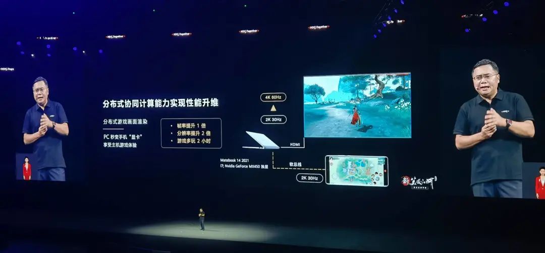 在发布会上,搭载 i7 处理器和 MX450 显卡的 MateBook 14 2021 款,可以把本来 2K 30hz 的游戏画面,直接拉升到 4K 60hz。