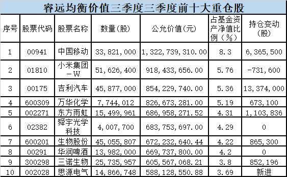 睿远基金另一位明星基金经理赵枫管理的睿远均衡价值三季度前十大重仓品种也基本保持稳定,中国移动、吉利汽车在三季度增持比例较多。