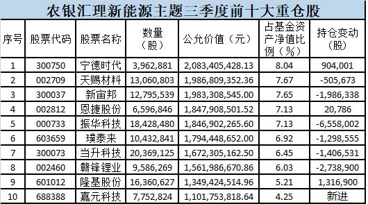 从农银汇理新能源主题三季度前十大重仓股来看,赵诣在三季度加仓新能源龙头——宁德时代,宁德时代成为农银汇理新能源主题的第一大重仓股,占基金资产比例达到8.04%。此外,还持有天赐材料、新宙邦、恩捷股份等。