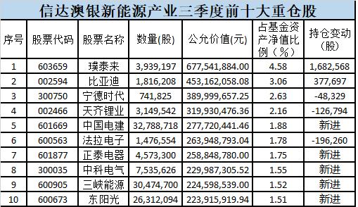 不仅在仓位上进行了调整,冯明远在三季度对重仓股的调整幅度也不小。从信达澳银新能源产业基金的前十大重仓股来看,重仓了璞泰来、比亚迪、宁德时代等个股。