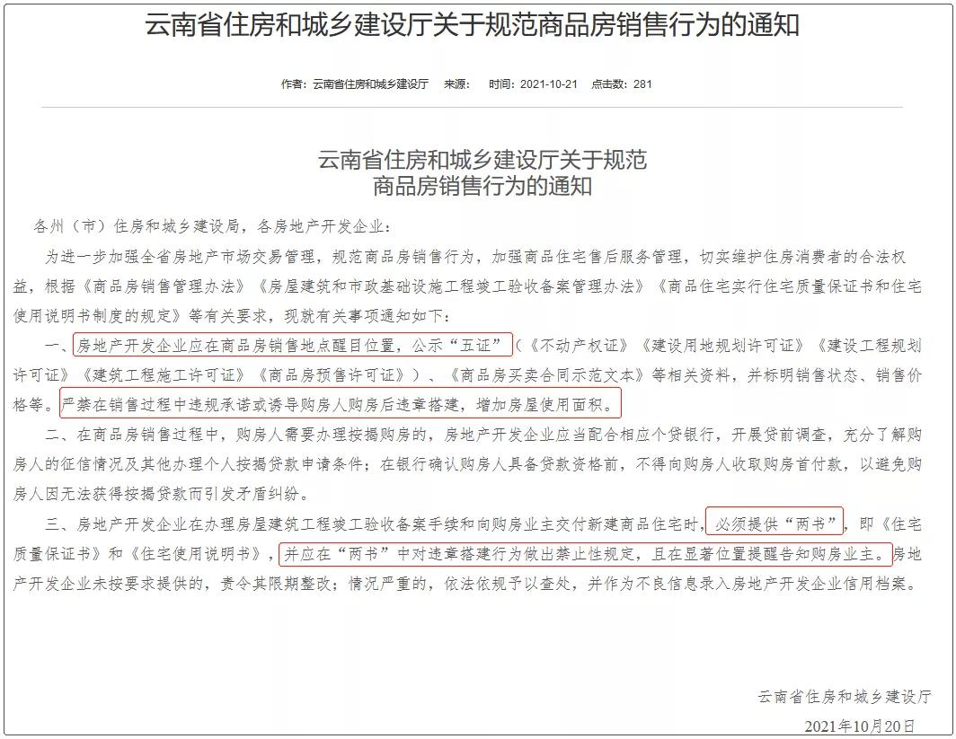 10月20日,云南省住房和城乡建设厅印发《关于规范商品房销售行为的通知》,其中明确了在银行确认购房人具备贷款资格前,不得向购房人收取购房首付款等3大项内容。