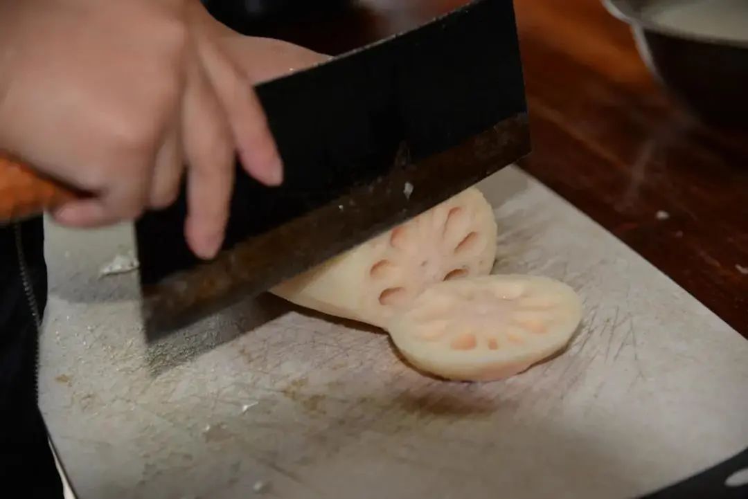 煮至藕软糯上色后关火,待藕稍稍冷却后,切片装盘。