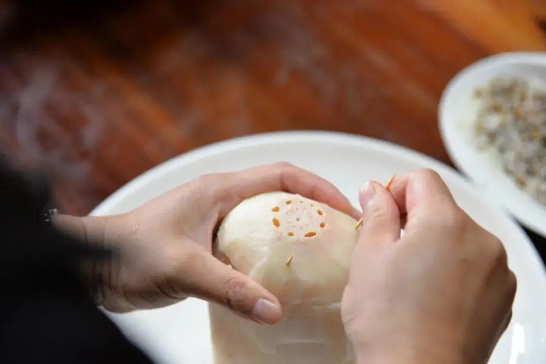 将糯米灌入莲藕,塞满后,盖上切开的藕盖,用牙签固定。