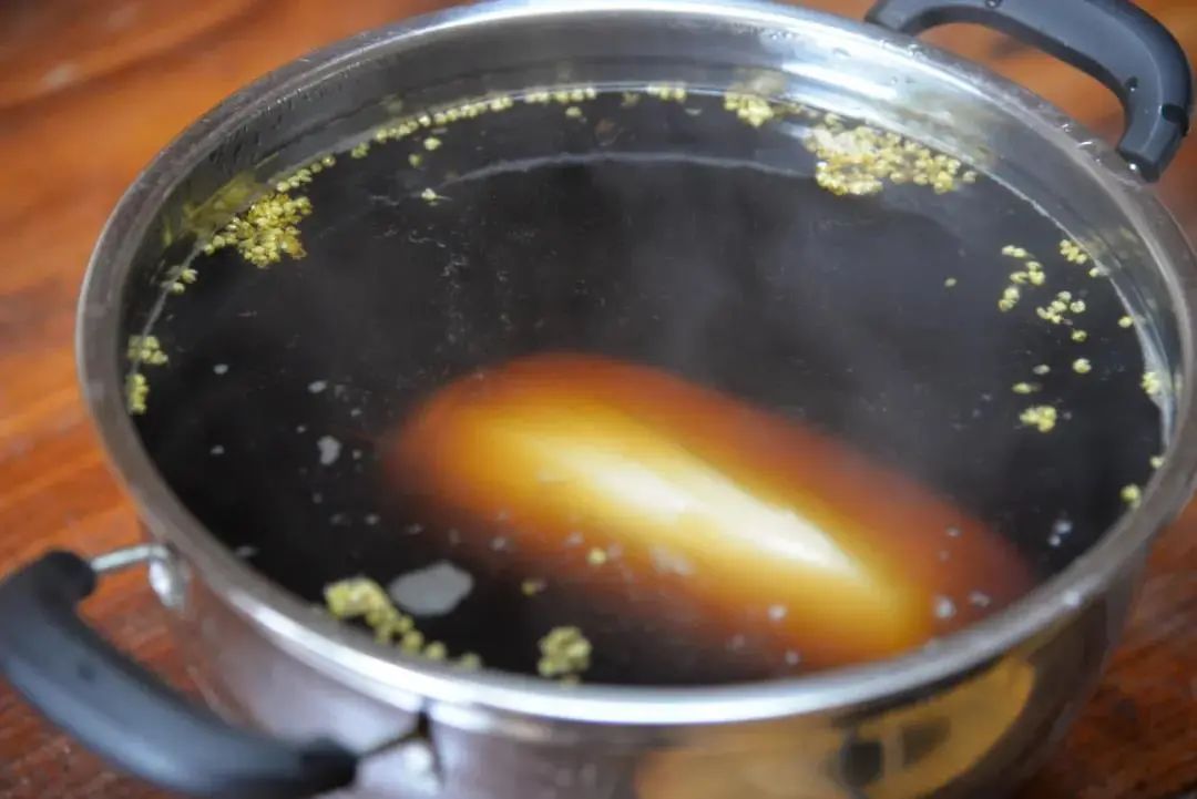 水煮沸后加入红糖、冰糖、桂花,放入藕节,大火煮沸后转小火,炖煮90分钟。