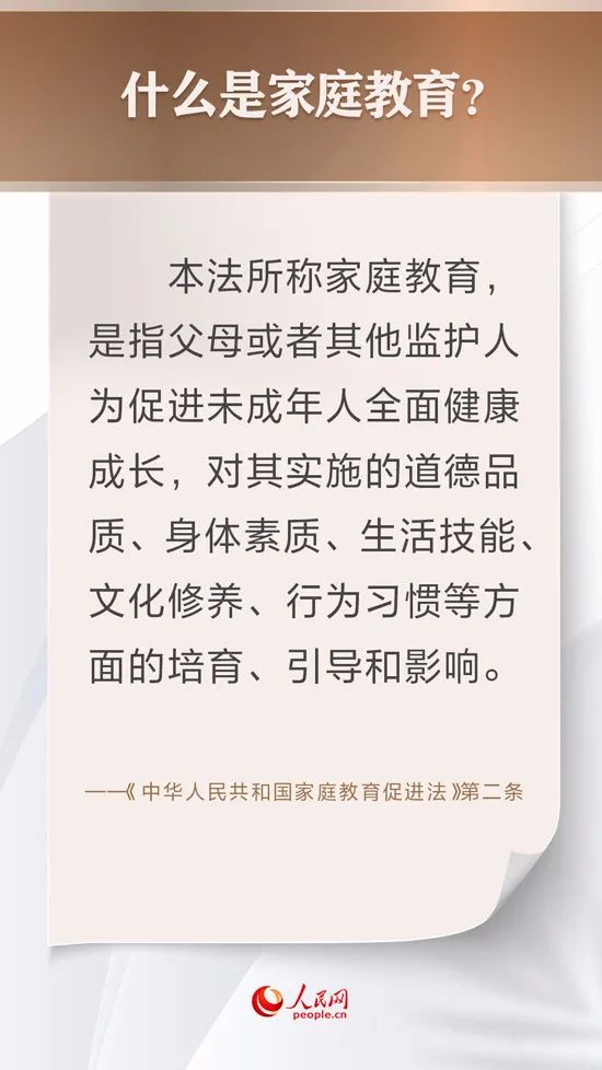 第二条 本法所称家庭教育,是指父母或者其他监护人为促进未成年人全面健康成长,对其实施的道德品质、身体素质、生活技能、文化修养、行为习惯等方面的培育、引导和影响。
