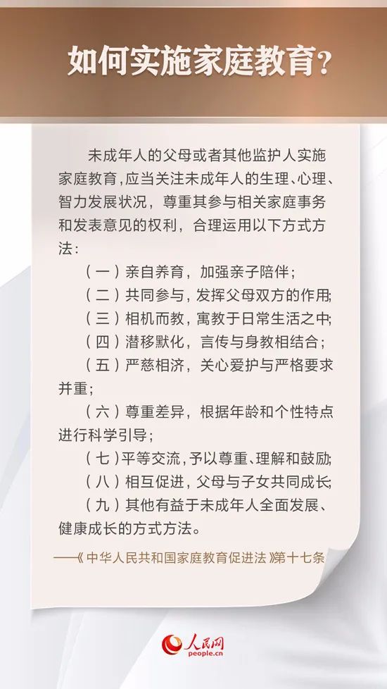 第十七条 未成年人的父母或者其他监护人实施家庭教育,应当关注未成年人的生理、心理、智力发展状况,尊重其参与相关家庭事务和发表意见的权利,合理运用以下方式方法:
