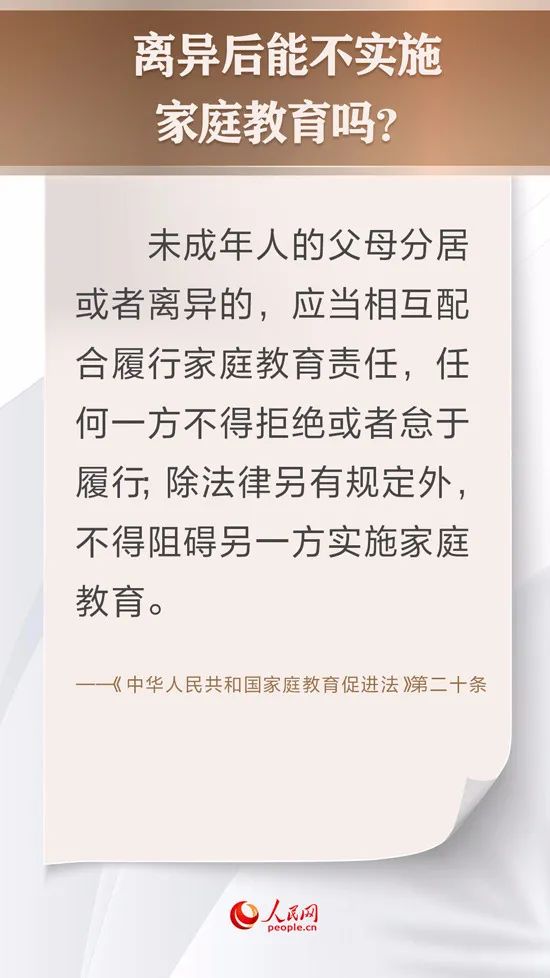 第二十条 未成年人的父母分居或者离异的,应当相互配合履行家庭教育责任,任何一方不得拒绝或者怠于履行;除法律另有规定外,不得阻碍另一方实施家庭教育。