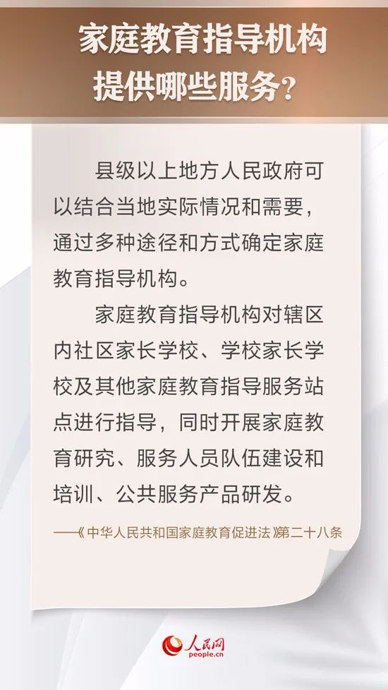 家庭教育指导机构对辖区内社区家长学校、学校家长学校及其他家庭教育指导服务站点进行指导,同时开展家庭教育研究、服务人员队伍建设和培训、公共服务产品研发。