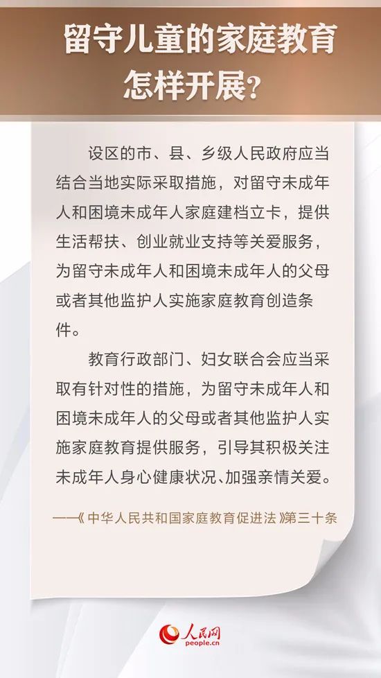 教育行政部门、妇女联合会应当采取有针对性的措施,为留守未成年人和困境未成年人的父母或者其他监护人实施家庭教育提供服务,引导其积极关注未成年人身心健康状况、加强亲情关爱。