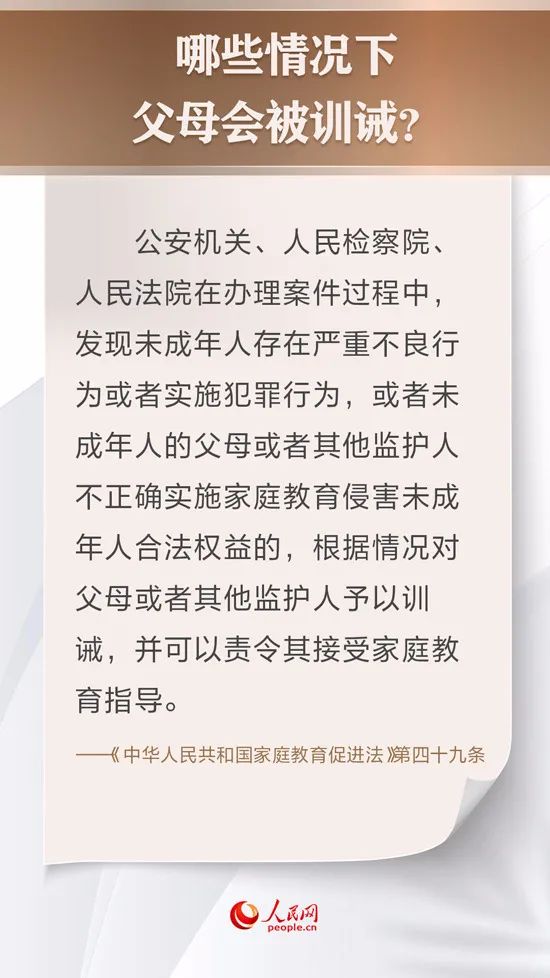 第四十九条 公安机关、人民检察院、人民法院在办理案件过程中,发现未成年人存在严重不良行为或者实施犯罪行为,或者未成年人的父母或者其他监护人不正确实施家庭教育侵害未成年人合法权益的,根据情况对父母或者其他监护人予以训诫,并可以责令其接受家庭教育指导。