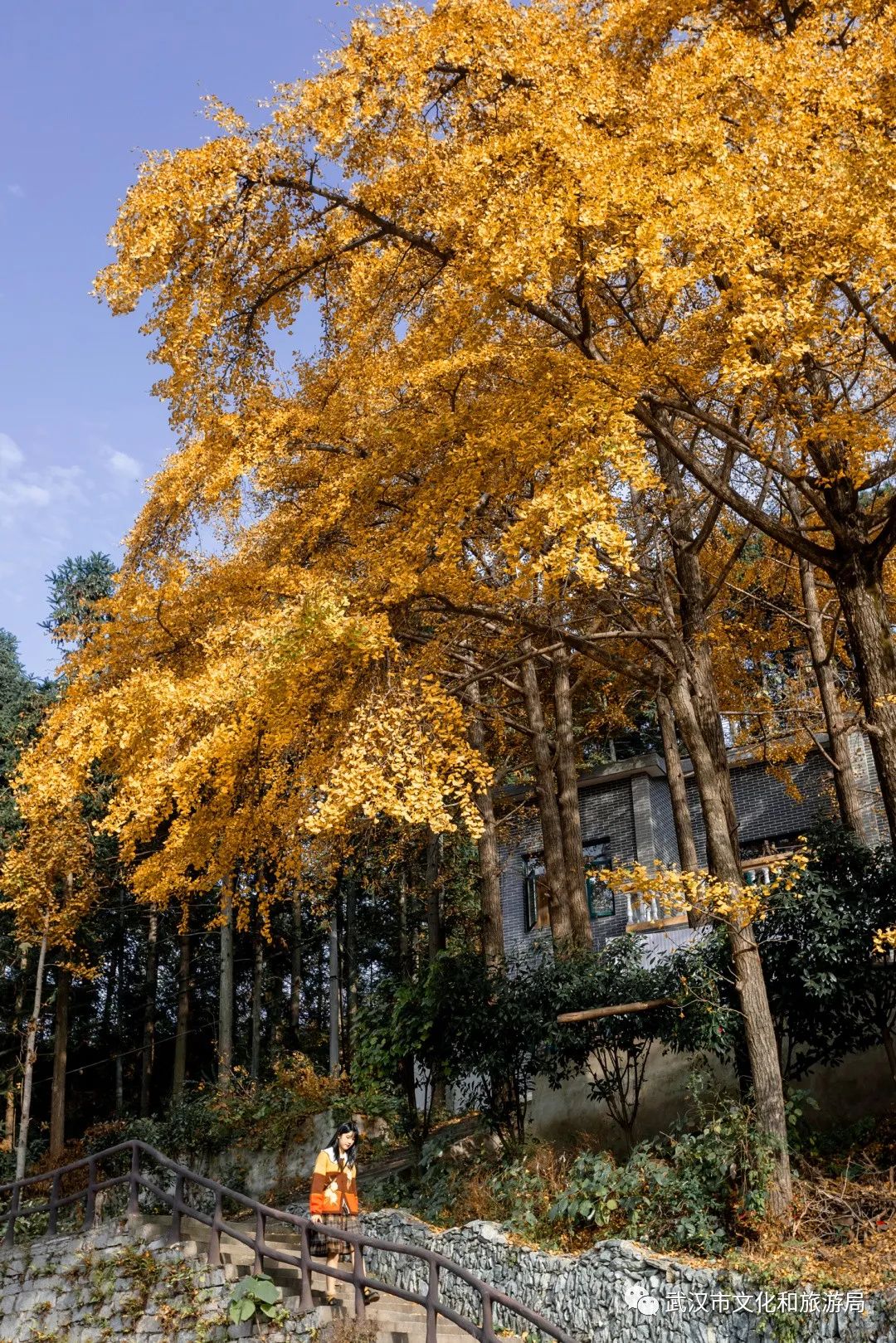 清凉寨是武汉海拔最高的景区,气温比市区略低,秋意浓得更早。清凉寨的民俗村里,高大的银杏树正织就金黄地毯。明晃晃一大片,让人不舍踩踏。