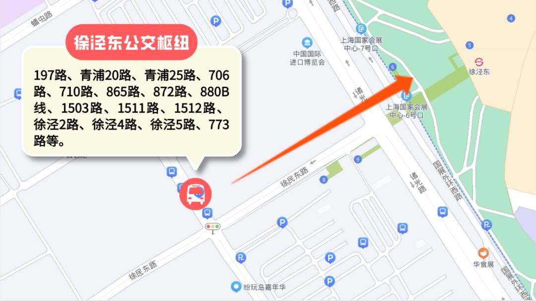 观众到达徐泾东站后,从4、5、6、8号口出站至场馆西登录厅入场(持进博会参展证人员可从4、5号口出站)。