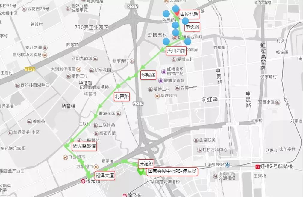 11月5日至10日,每天8:00-20:00,4条停车场接驳线往返周边停车场和国家会展中心;2条虹桥商务区停车场接驳线,串起虹桥商务区服务进口博览会的多个楼宇共享停车场库和国家会展中心。