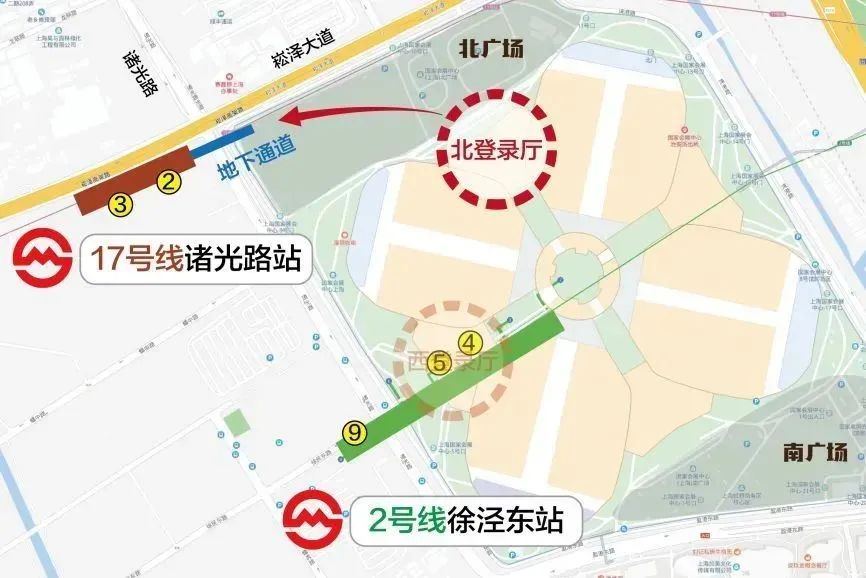 建议线路:从崧泽大道诸光路港湾式公交站点出发,经诸光路地道至北广场,前往国家会展中心北登录厅。