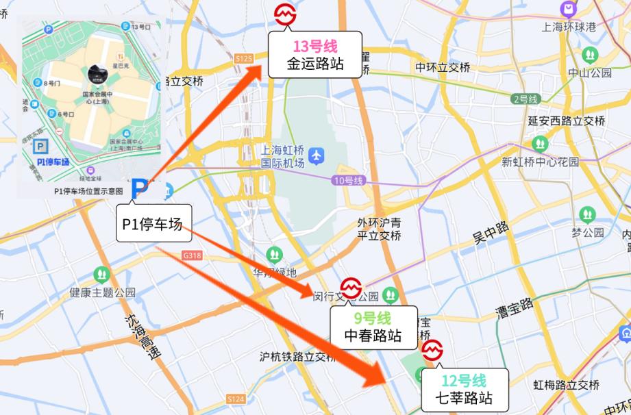 建议线路:从P1停车场出发,步行至徐民东路诸光路路口,登上二层步廊,沿二层步廊向东继续步行,最终到达国家会展中心西登录厅。