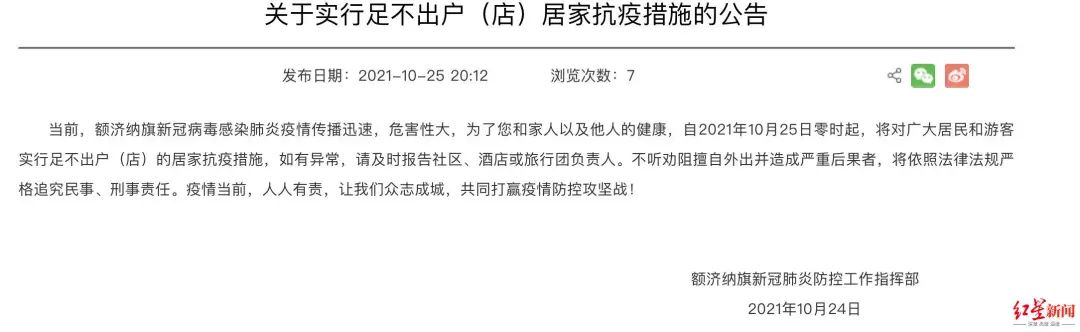 10月19日,阿拉善盟新冠肺炎防控工作指挥部发布第31号公告,宣布额济纳旗启动IV级应急响应机制,采取“关闭出入额济纳旗通道和策克口岸,实行临时管控”等措施。同时,为切断传播,额济纳旗也自10月18日关闭了出入旗通道、关闭口岸,实行48小时临时管控。