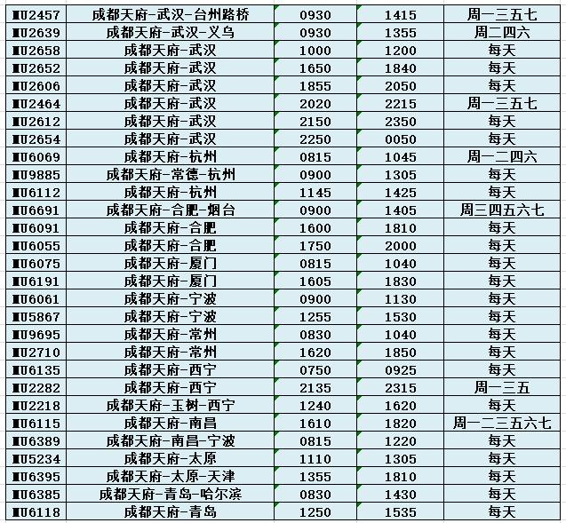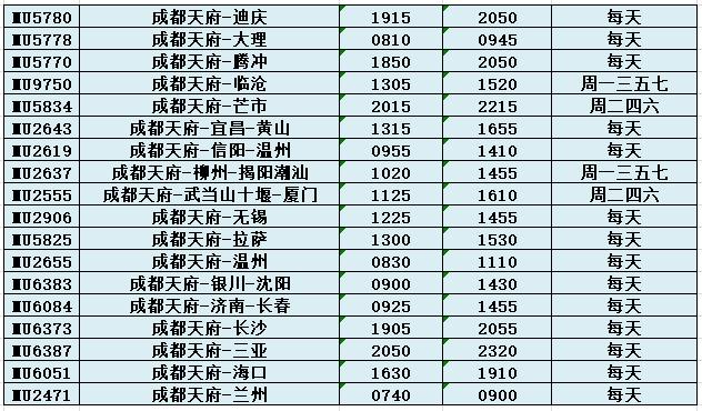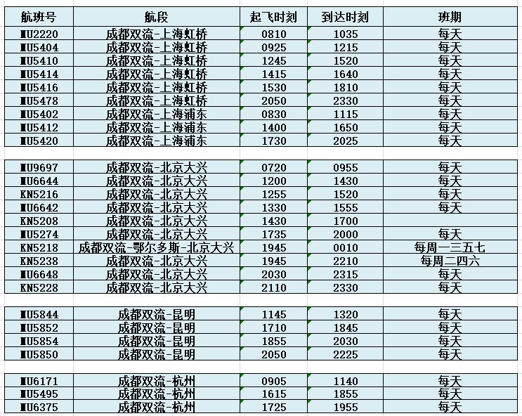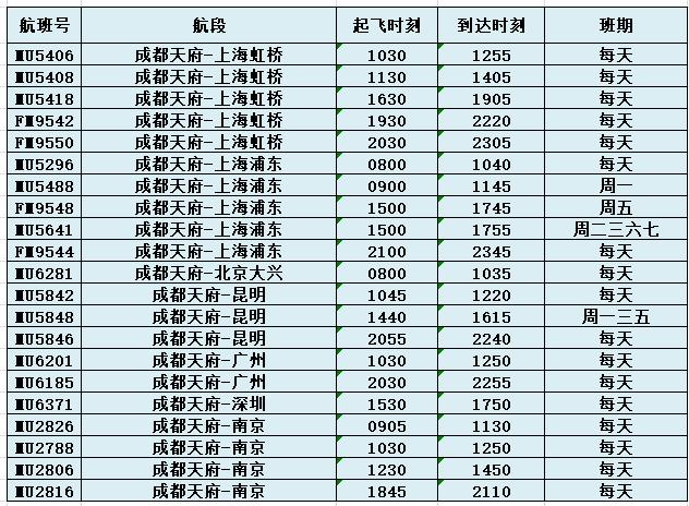 东航四川分公司公布了新航季成都出港航班计划,其显示东航在成都运营的大部分航班转场至天府机场出港。