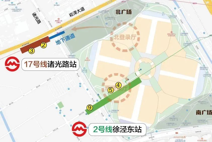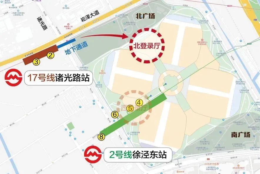 建议线路:从崧泽大道诸光路港湾式公交站点出发,经诸光路地道至北广场,前往国家会展中心北登录厅。