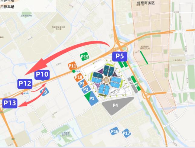 进博会举办期间,提供11处临时停车场、16处虹桥商务区停车场(库)供参展商客预约停车。