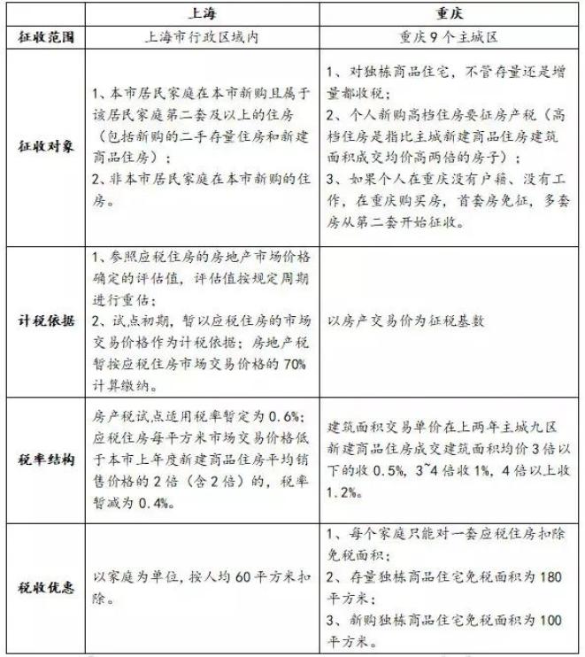 其中,上海在征收房产税时,采用的税率为0.4%、0.6%两档税率,而重庆在征收房产税时采用的税率为0.5%、1%、1.2%三档税率。